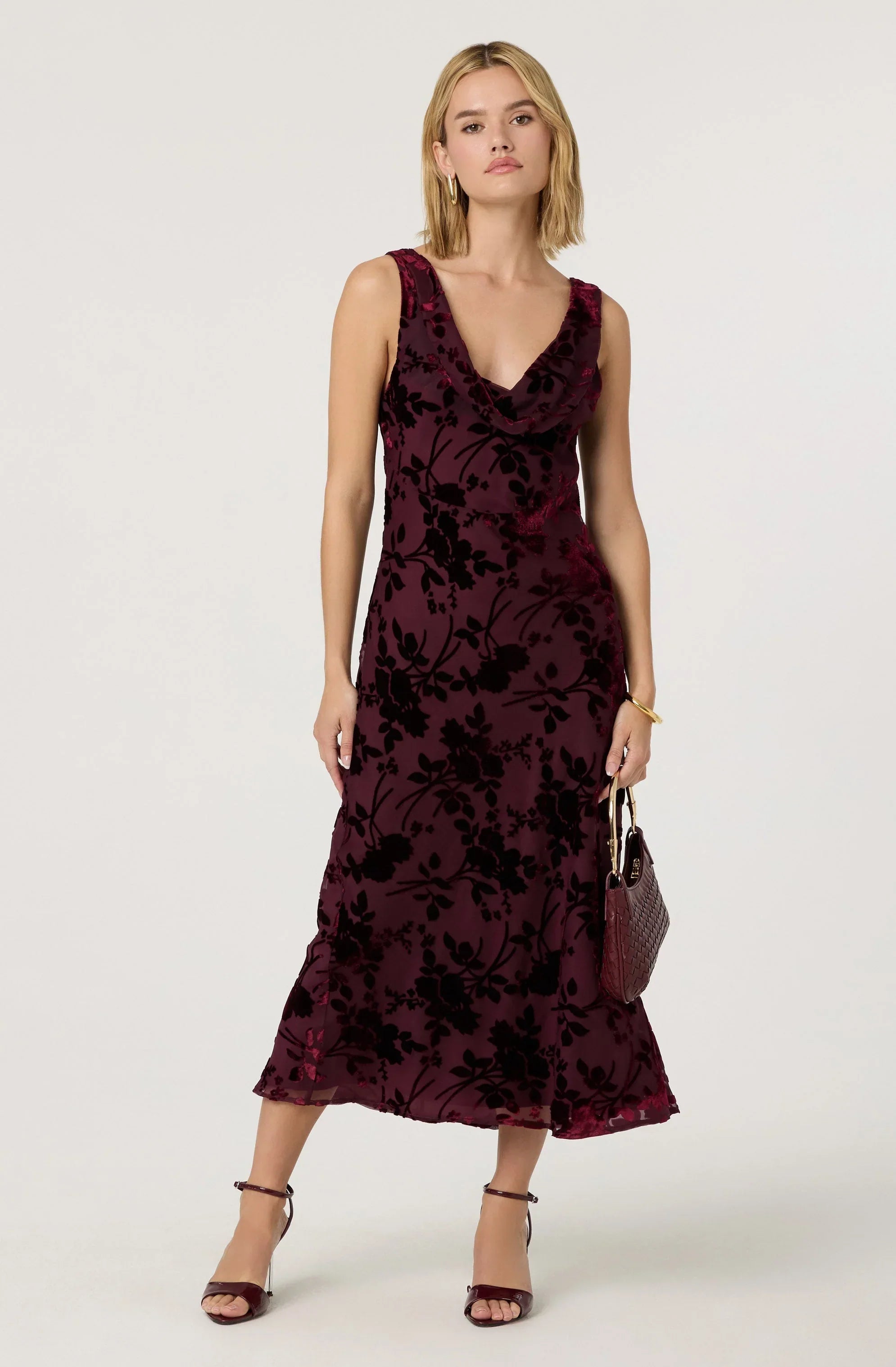 This floral burnout design adds texture and a touch of romantic charm to this cowl neck dress. Perfect for weddings, fancy dinners, or any occasion where you want to feel beautiful without trying too hard.