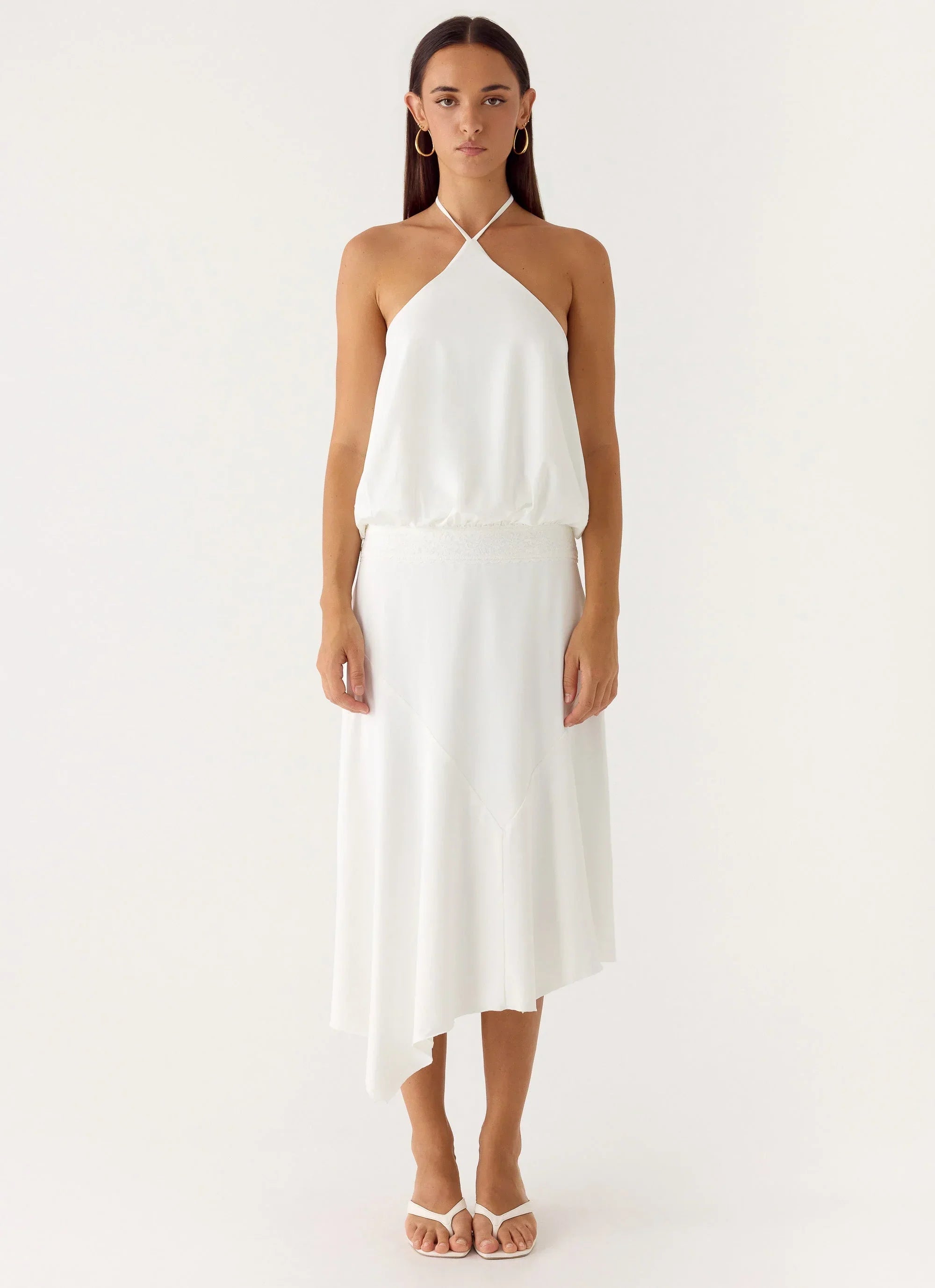 The To The Girls Midi Dress is made for sun-soaked days that flow into golden-hour nights. Featuring a halter neckline and lace middle feature, this midi-length silhouette drapes with soft ruched detailing and an asymmetrical hem for effortless, editorial movement.